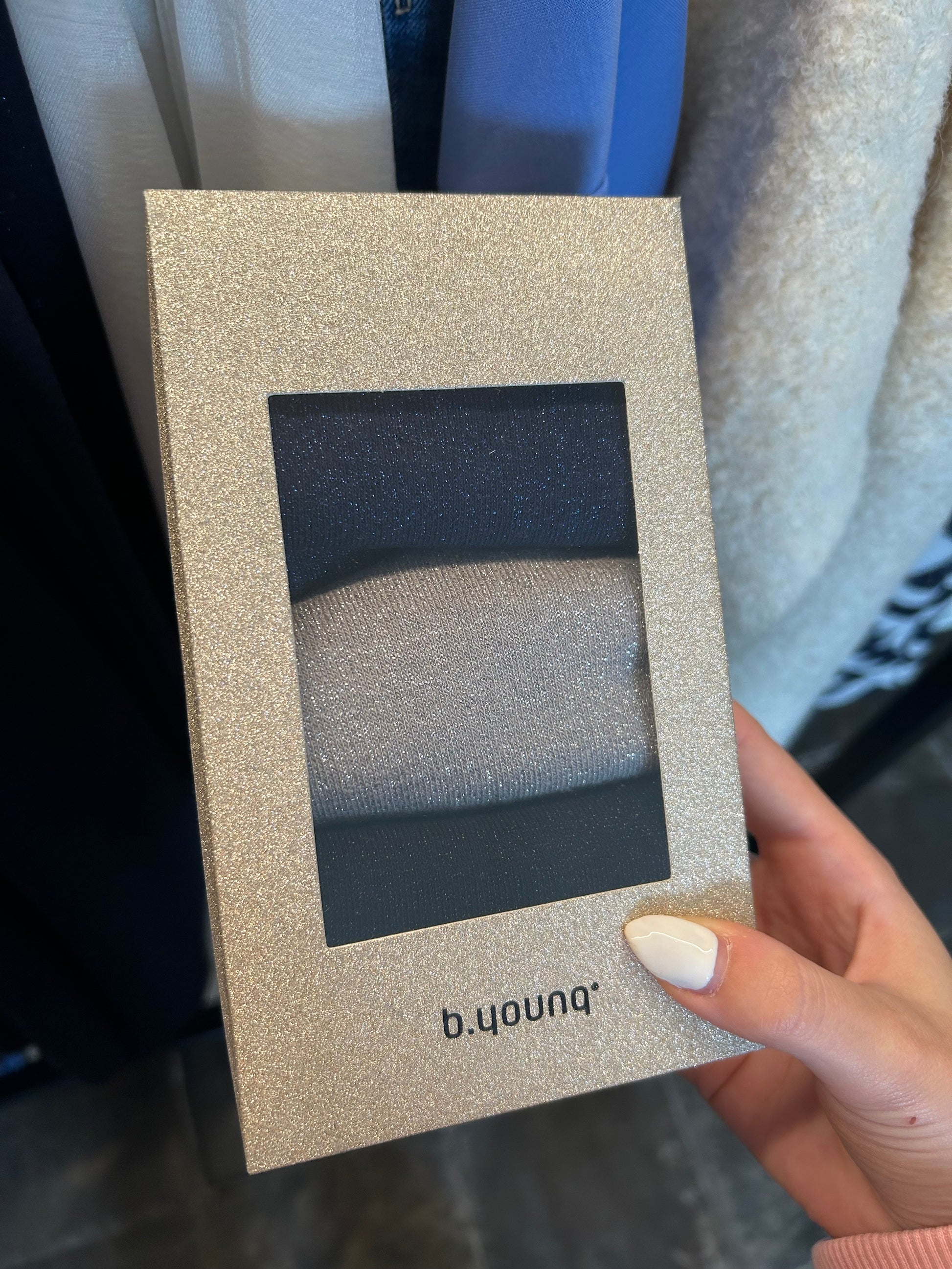 3 paar kousen, zwart, zilver en blauw.